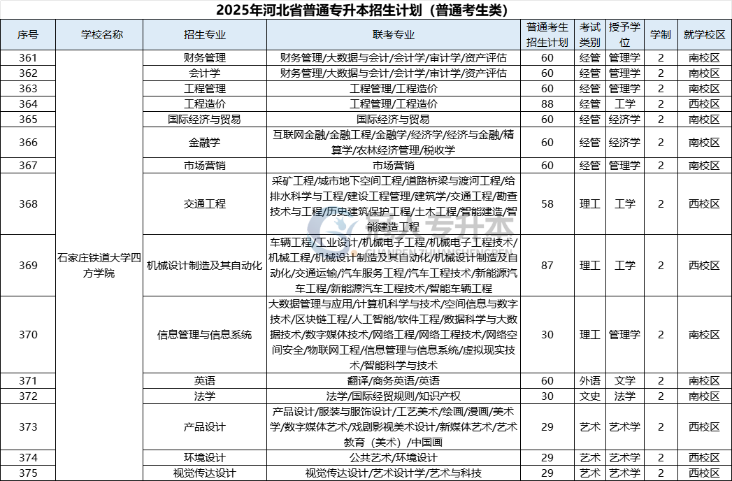 2025年河北省普通專升本石家莊鐵道大學(xué)四方學(xué)院專升本招生計劃已公布,參加2025年河北專升本考試的考生請查看下表2025年石家莊鐵道大學(xué)四方學(xué)院專升本招生計劃信息。