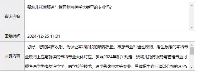 關于2025年河北專升本考試跨專業問題中“嬰幼兒托育服務與管理專業能不能報考醫學大類里的專業”問題,河北教育考試院也給出了相關回復。